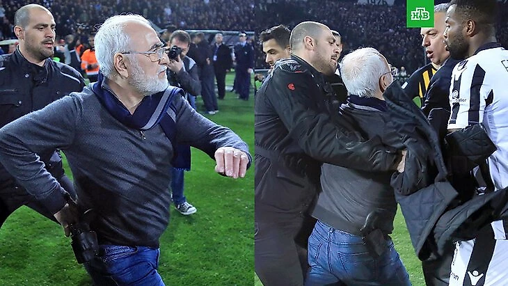 После долгих споров на Коминоса пошел сам Саввиди. Правой рукой взбешенный владелец ПАОК держался за кобуру с пистолетом на ремне. Президента с трудом оттащили от рефери, но Саввиди не сдавался: после провальной попытки наехать на судью пошел драться с президентом АЕКа.