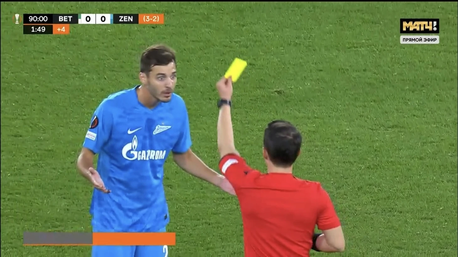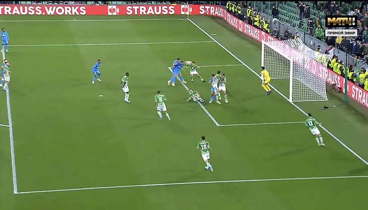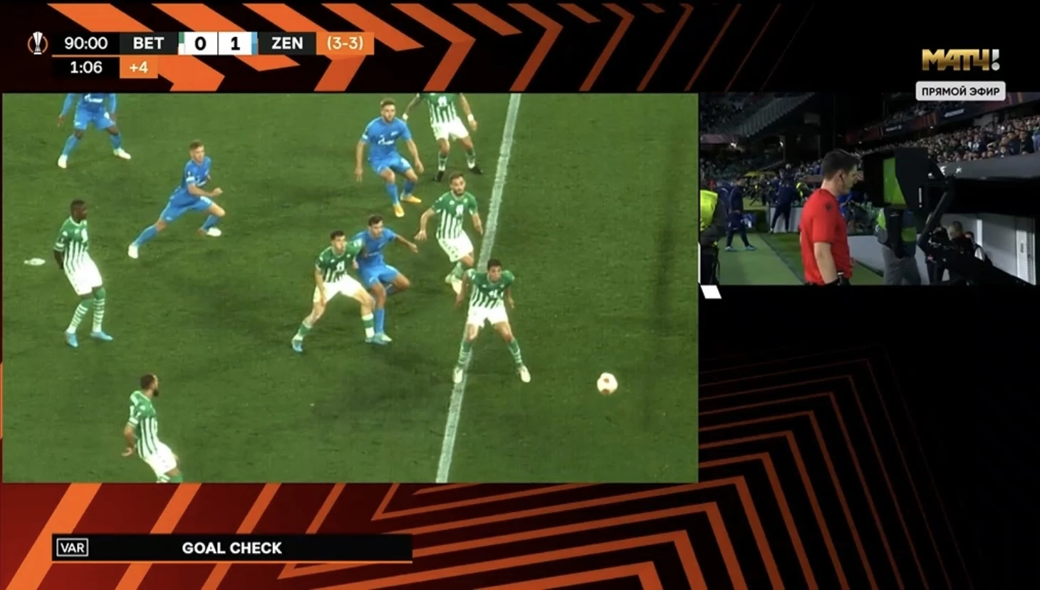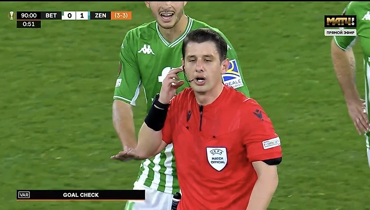 «Зенит» отпраздновал гол, но в это время игрок «Бетиса» лежал на газоне и держался за ногу. На это обратили внимание видеоассистенты судьи – позвали главного арбитра пересмотреть повтор. Причина: во время навеса Ерохин наступил на ногу соперника.