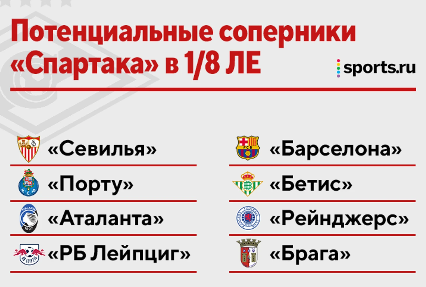 Севилья, Аталанта, Лейпциг, Барселона, Бетис, Рейнджерс, Брага, Порту.