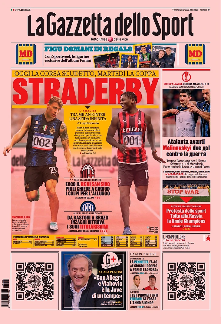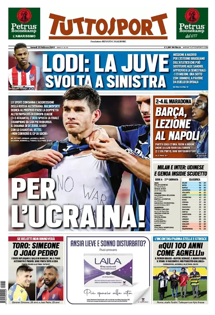TuttoSport основным заголовком поставил однозначное «За Украину!»: «Спорт приговорил агрессию России на Украине. Малиновский посвятил стране дубль против «Олимпиакоса» в Лиге Европы (3:0 «Аталанты»). УЕФА забрал финал Лиги Чемпионов у Санкт-Петербурга. Драма Де Дзерби, в Киеве с «Шахтёром». Феттель: «Не поеду Гран-При Сочи».