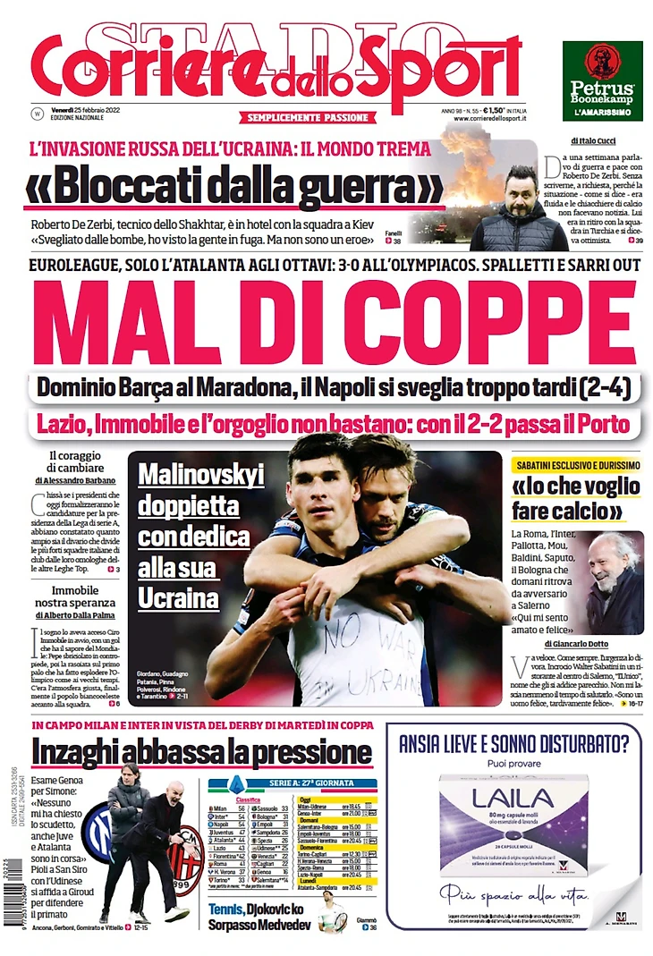 Gazzetta в заголовке акцентирует внимание на единственном победившем клубе: «Аталанта» проходит вперёд. Малиновский, два гола против войны». «Слишком сильная «Барселона» для «Наполи», поражение 4:2 на «Марадоне». Вылетел также «Лацио»: 2:2 с «Порту».