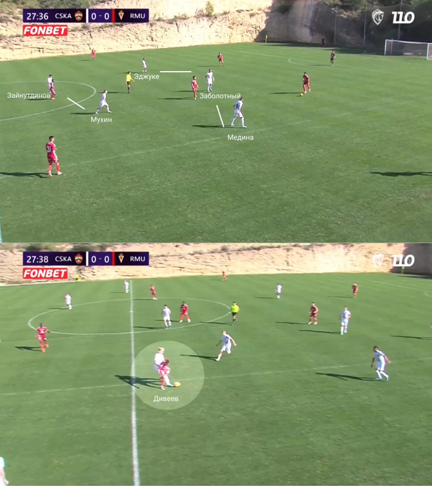 На видео более наглядный пример (таймкод – 1:00:06): Медина выдвинулся выше, Дзагоев и Зайнутдинов дошли до штрафной, поэтому позиции Облякова, Бийола, Фукса и Дивеева страховали ситуацию (справа заметно, что Марио изначально находился в полупозиции, как и Обляков). Когда «Мурсия» поменяла направление, Иван выбросился на фланг, а его игрока подобрал Бийол – в итоге ЦСКА зажал соперника, вынудив выбить мяч.