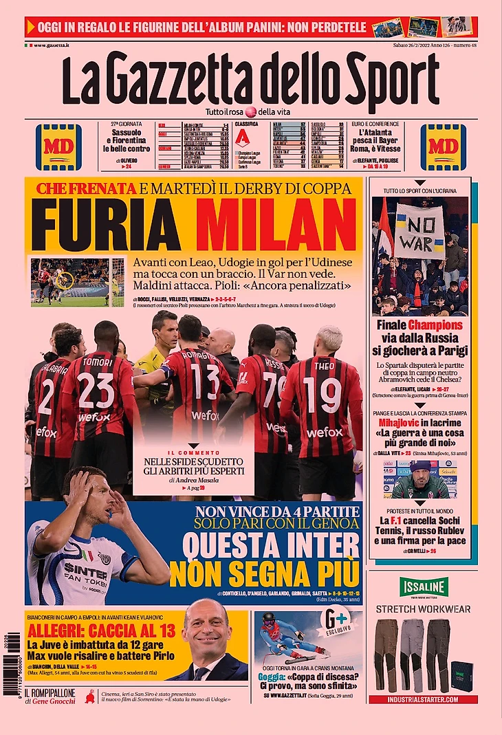 TuttoSport также отметила результаты миланских клубов в заголовке «Гнев «Милана», кризис «Интера»: «Удоджи, гол плечом, когда сравнял «Удинезе». Пиоли: «Очевидное нарушение, в очередной раз мы наказаны». Мальдини: «Хватит арбитров-дебютантов на «Сан Сиро». Нерадзурри, остановленные хорошим «Дженоа», не воспользовались этим: 2 очка в последних 4 матчах».