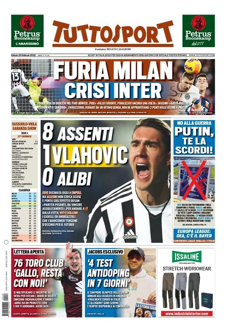 «8 отсутствующих, 1 Влахович, 0 алиби» – такой заголовок TuttoSport дал перед сегодняшним матчем «Ювентуса»: «Юве» сокращён сегодня в «Эмполи», но Аллегри не ищет оправданий и ставит на эффект Душана: «Весомый матч, абсолютно необходимо побеждать». Чтобы подняться на 7 очков от вершины. Вити и Асллани – жемчужины Андреаццоли, на которых Бьянконери положили глаз на будущее».