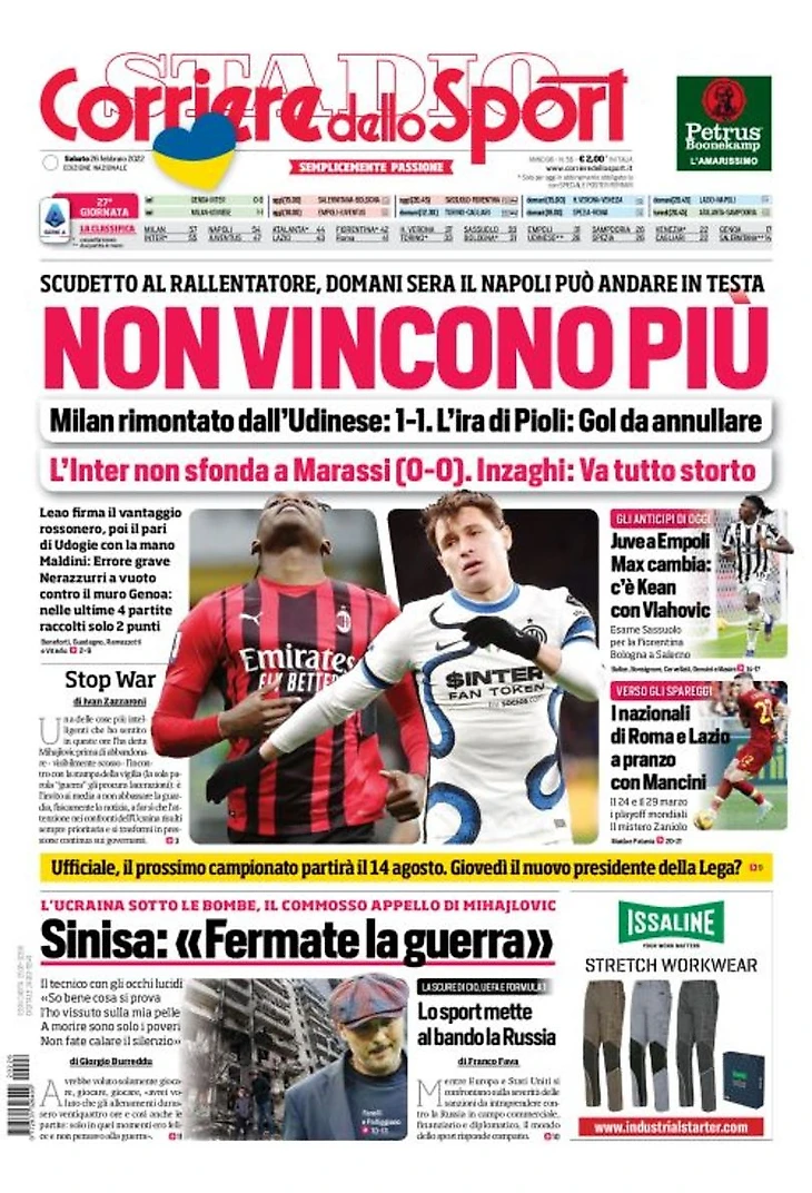«Больше не побеждают» – таким заголовком Corriere отреагировала на ничейные результаты «Милана» и «Интера»: «Скудетто на замедлении, завтра вечером «Наполи» может взойти на вершину. «Милан» позволил отыграться «Удинезе»: 1:1. Гнев Пиоли: «Гол необходимо было отменить». Леау вывел Россонери вперёд, затем ничья от Удоджи благодаря руке. Мальдини: «Серьёзная ошибка». «Интер» не пробил на «Марасси» (0:0). Индзаги: «Всё идёт не так». Нерадзурри остались ни с чем против стены «Дженоа»: в последних 4 играх заработано только 2 очка».