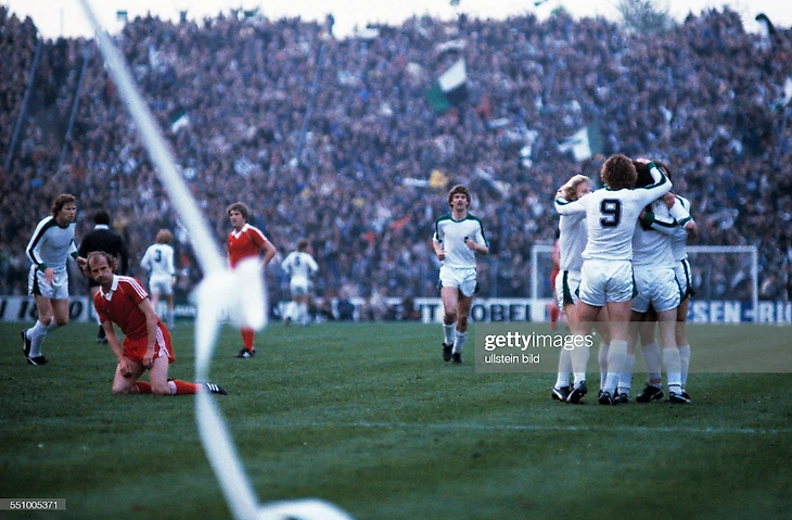 Надо сказать, что до весны 1980 ни одному иностраному клубу не удавалось справиться с командами Бундеслиги- они должны были сделать это сами! Первая чисто западногерманская дуэль состоялась в четвертьфинале, в которой Кайзерслаутерн (в его рядах уже блистал 23-летний Десятиборец Ханс-Петер Бригель, также будущий чемпион Евро-80) попортил немало нервов мюнхенским гигантам. Кайзерслаутерн выиграл домашний матч со счетом 1-0, благодаря 18-летнему парню по имени Аксель Бруммер, который прошел мимо Ханса Вайнера и Пола Брайтнера и отправил мяч в сетку с метров 16. Через неделю обе команды разделят очки пополам в чемпионате ФРГ (1-1), а еще через четыре дня они встретились в Мюнхене в ответном еврокубковом матче. Всего за 17 минут до конца матча Бавария вела лишь 2-1, и этого результата было достаточно для Кайзерслаутерна, одетого в непривычные зеленые футболки, чтобы пребывать в полуфинале согласно правилу преимущества выездного гола. Но затем вратарь Кайзерслаутерна, легенда клуба швед Ронни Хелльстрем, не смог удержать мяч после удара со штрафного от Норберта Янзона; Клаус Аугенталер бросился на отскок и был сбит. Брайтнер реализовал последовавший пенальти, прежде чем Дитер Хенесс добавил страховки, забив гол на 82-й минуте (4-1). Пока Бавария не без труда протискивалась мимо Кайзерслаутерна, её главный конкурент, Мёнхенгладбах пожинал славу.