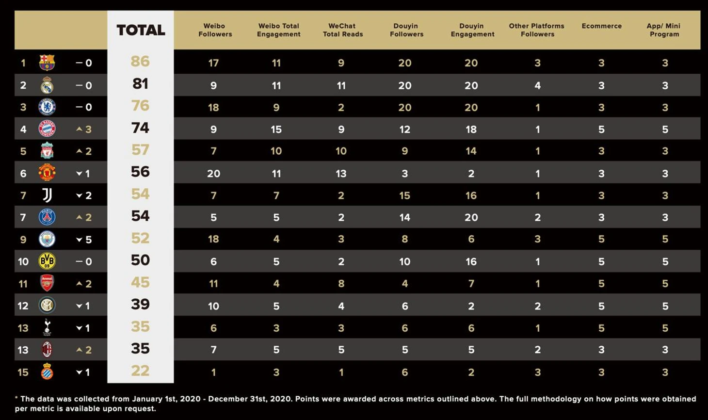 Компания Mailman подготовила отчет о популярности футбольных клубов, игроков и лиг в самой густонаселенной стране в мире. Оценка велась на основе digital-рейтинга, который создавался с учетом количества подписчиков в соцсетях, вовлечения аудитории во взаимодействие с контентом клуба и «дружелюбности» клубных активаций и платформ к китайским пользователям.