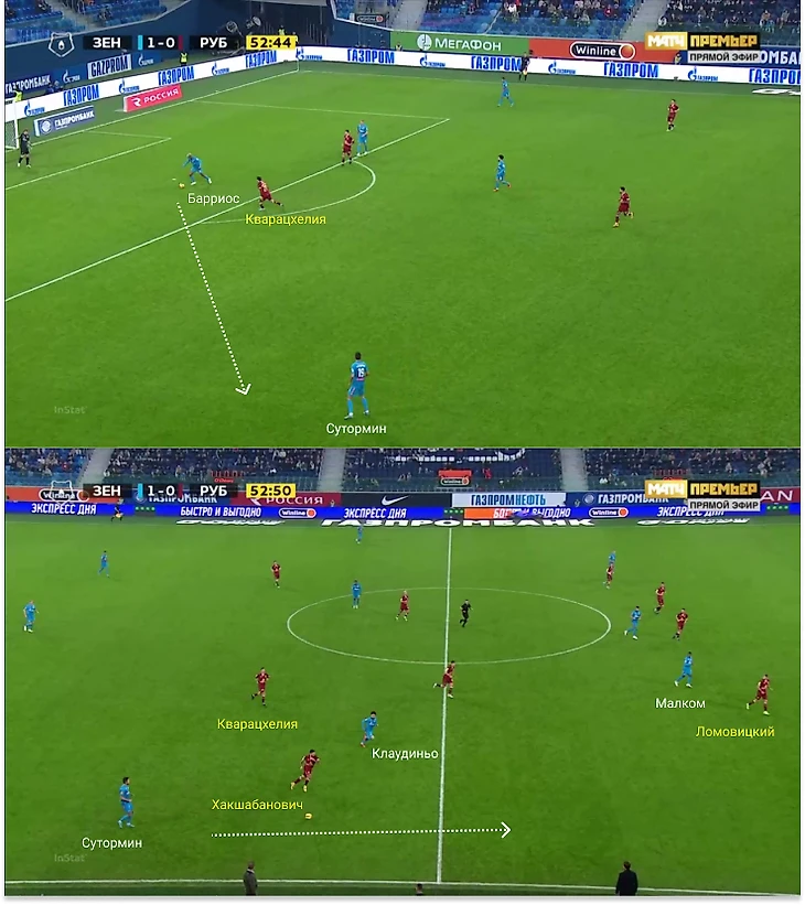 Например, в этом эпизоде Хвича разрывался между Суторминым и Барриосом: Кварацхелия бросил Алексея и еще сильнее оголил зону. Это привело к неплохому моменту: Сутормин забросил мяч на Малкома, после чего бразилец покатил на свободного Кругового (Дрейер тоже не опустился).
