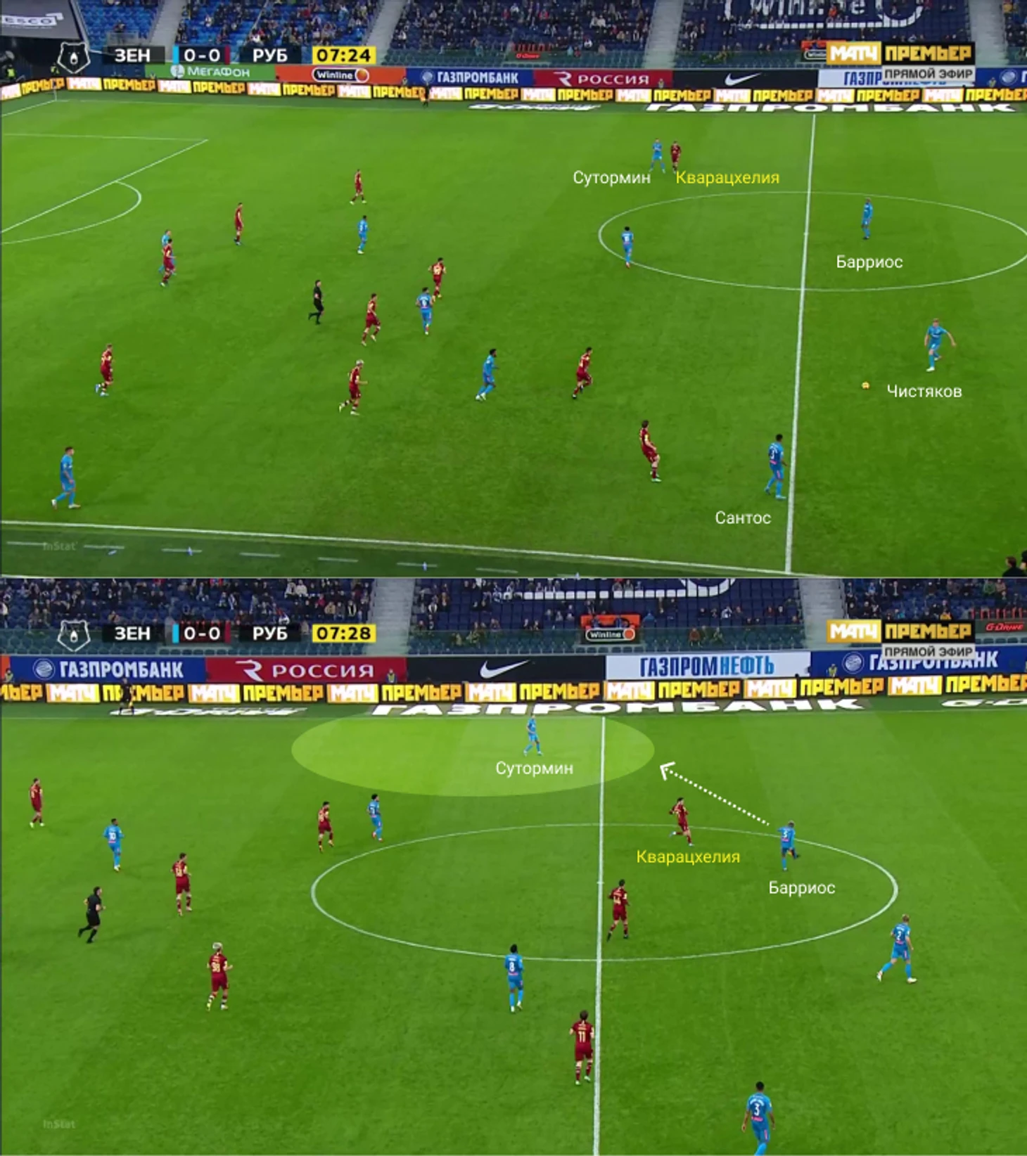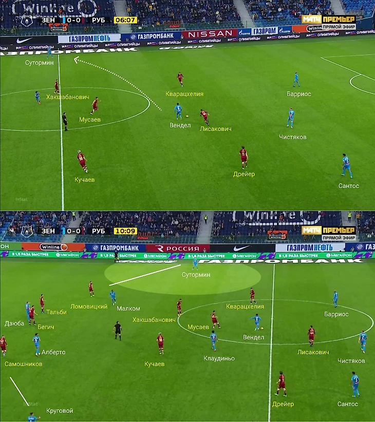 Ниже – пара примеров, как «Зенит» легко начинал некоторые атаки. В первом розыгрыше Чистяков и Вендел отыграли Лисаковича, во втором – Сутормин подал в сторону Дзюбы, после чего Артем покатил под удар Клаудиньо. На нижнем скрине отдельный фокус на Малкоме и Альберто – оба нападающих сместились в середину, что еще сильнее оголило зону для Сутормина и Кругового.