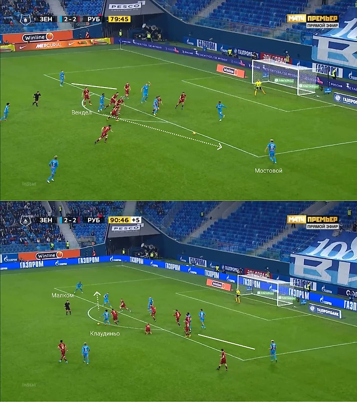 В большинстве «Зенит» продолжил играть широко: Вендел шикарной передачей нашел Мостового (Андрей не попал в створ), Малком неудачно исполнил момент в скоростной контратаке, сделал 8 передач в штрафную перед забитым голом, Клаудиньо классно нашел Малкома в широкой позиции – так «Зенит» заработал решающий угловой.
