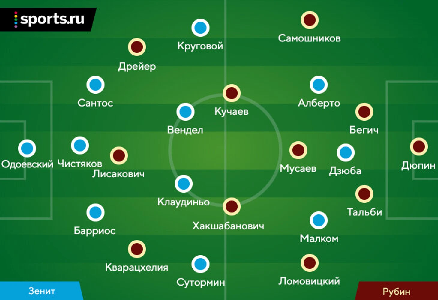 Сергей Семак полностью сохранил состав и схему относительно выезда в Севилью: Даниил Одоевский занял место в воротах, Юри Алберто теперь дебютировал и в чемпионате России, Клаудиньо вышел в опорной зоне, Далер Кузяев вновь не попал в заявку (приболел), а Ярослав Ракицкий присоединится к команде во вторник (по словам Сергея Семака).