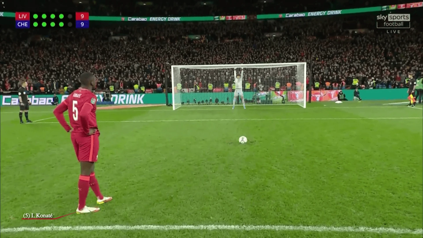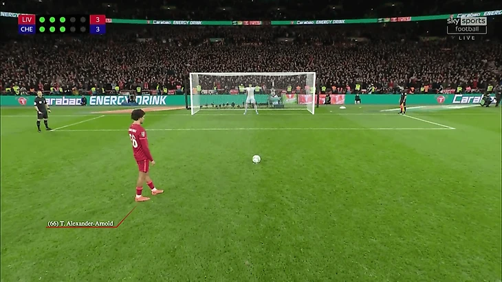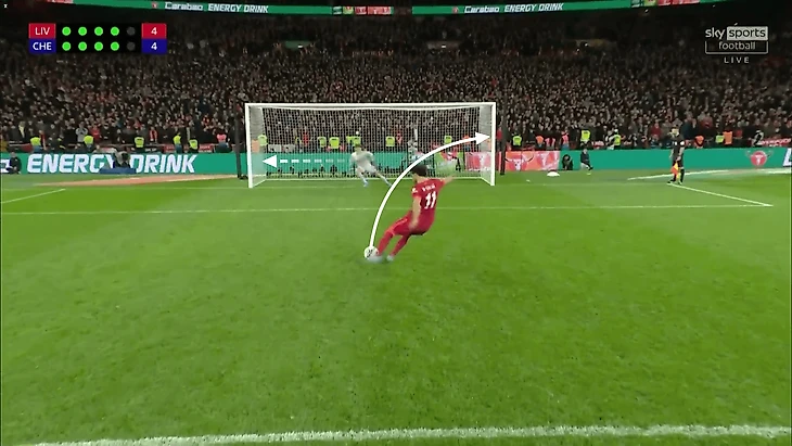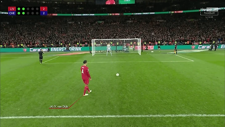 Посмотрите, где стоит Кепа. Он знает, что Ван Дейк хочет пробить влево, и стоит на той же стороне ворот, чтобы попытаться сбить его с толку.
