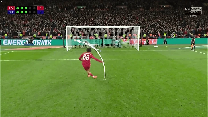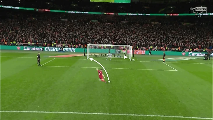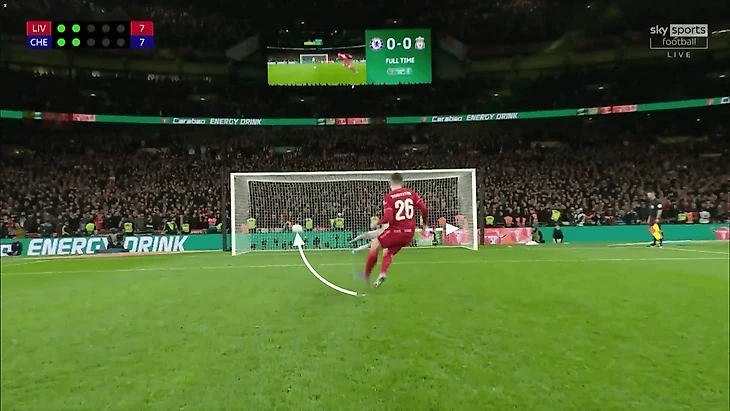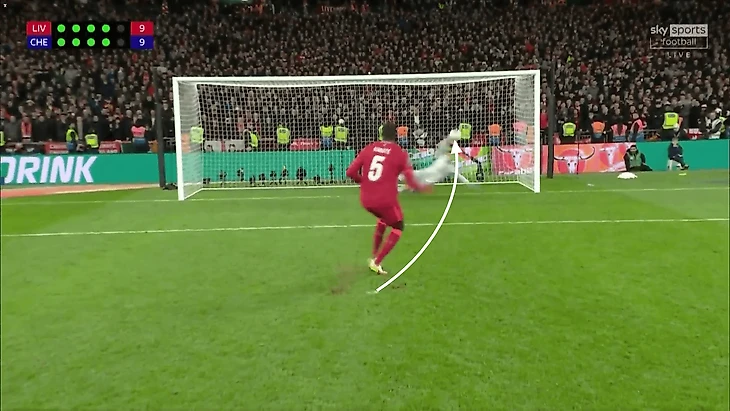 Решение Кепы, казалось, только подтолкнуло Ван Дейка к такому удару. И, потратив всего три секунды на то, чтобы успокоиться, а затем всего два шага, защитник направил мяч влево.