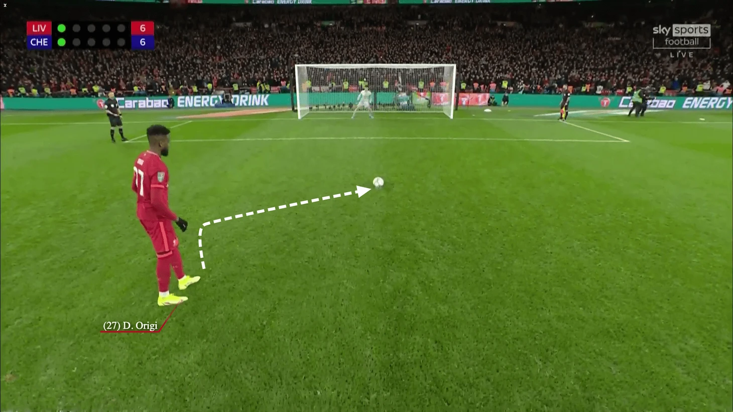 Ориги отправил мяч в середину, чуть правее центра. Это обмануло Кепу, который подумал, что он полетит влево.