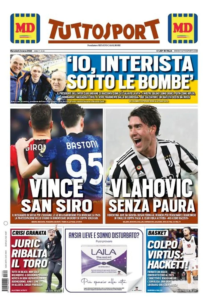 TuttoSport в своём заголовке «Выиграл «Сан Сиро» отмечает единственного «победившего»: «Послание Шевы в честь Украины. 50 тысяч флажков для призыва к миру: участие стадиона заставило забыть Дерби в Кубке без голов».