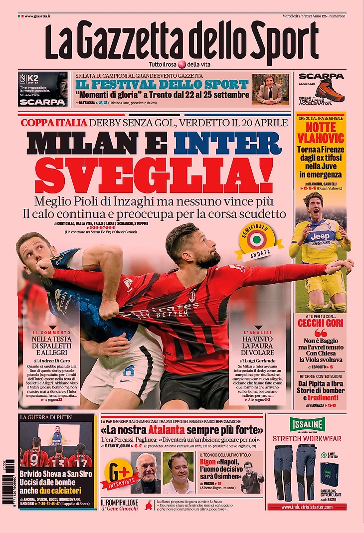 «Милан» и «Интер», просыпайтесь!» – таким заголовком Gazzetta отреагировала на вчерашнюю ничью миланских клубов: «Кубок Италии, Дерби без голов, вердикт 20 апреля. Пиоли был лучше Индзаги, но никто больше не побеждает. Спад продолжается и вызывает опасения в борьбе за Скудетто».