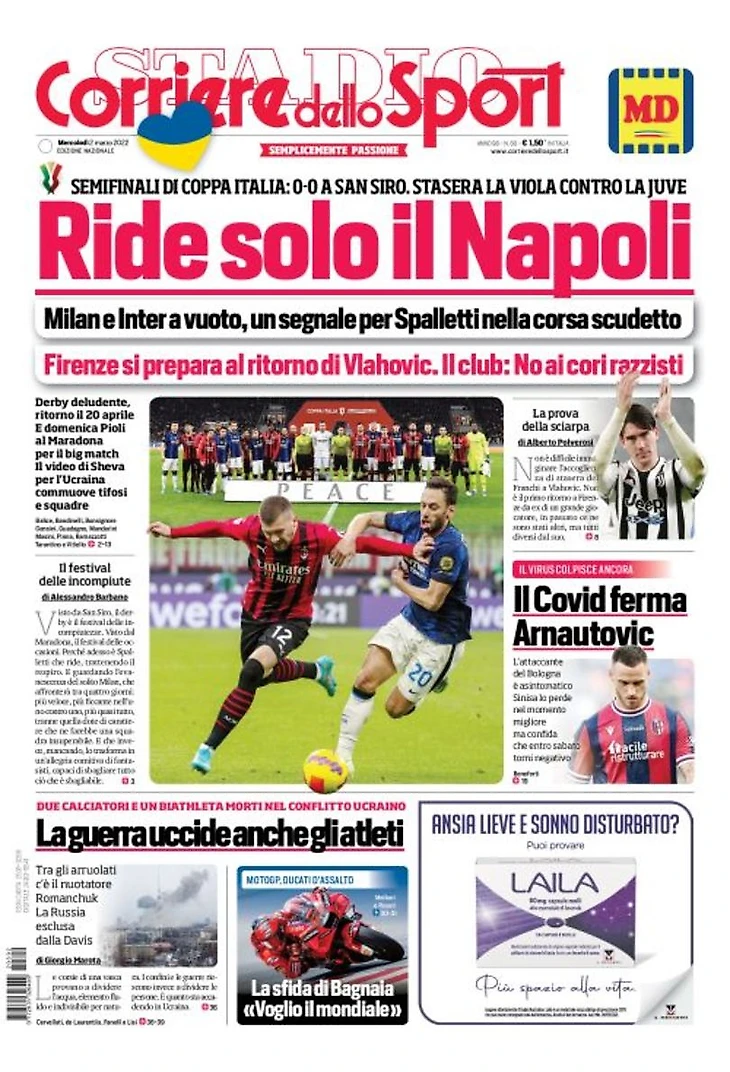 Corriere определяет другого выгодоприобретателя от прошедшего матча в заголовке «Доволен только «Наполи»: «Полуфиналы Кубка Италии: 0:0 на «Сан Сиро», этим вечером «фиалки» против «Юве». «Милан» и «Интер» остались ни с чем, сигнал для Спаллетти в борьбе за Скудетто». Разочаровывающее Дерби, ответный матч 20 апреля. И в воскресенье Пиоли на «Марадоне» в топ-матче. Видео с Шевой за Украину объединило болельщиков и команды».