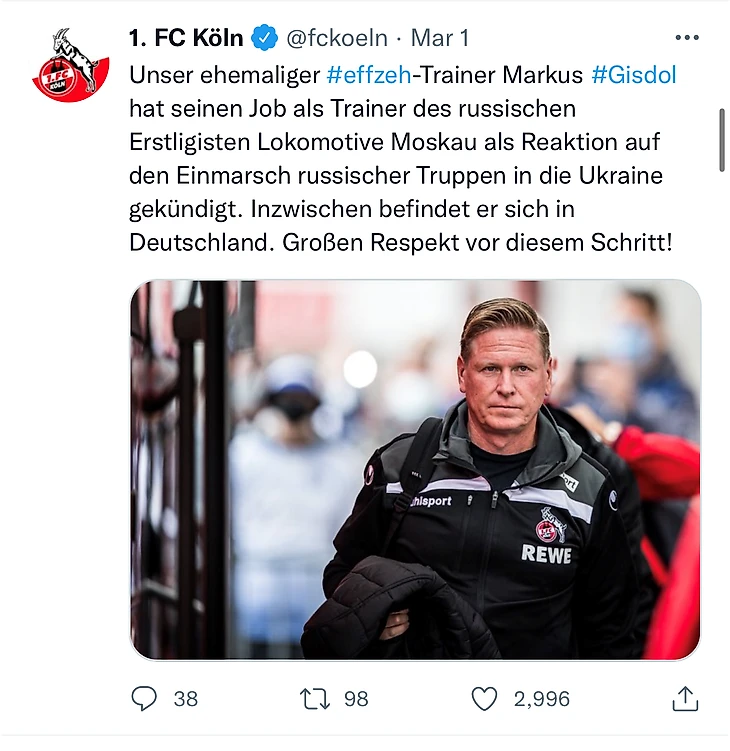 Стоит признать, что и на стороне тренера оказался и его бывший клуб. Немецкий «Кёльн» не остался в стороне и отреагировал на столь серьёзный шаг со стороны Гисдоля в своём твиттер аккаунте: «Наш бывший тренер уволился с поста в московского «Локомотива», отреагировав тем самым на вторжение российских войск в Украину. Сейчас он находится в Германии. Огромный респект за такой шаг!»
