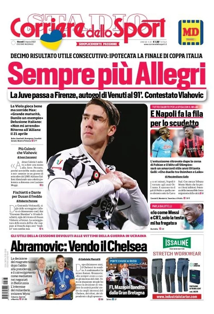 Громкой новостью международного футбола стала предстоящая смена владельца «Челси». Corriere отреагировала на неё заголовком «Абрамович: «Продам «Челси»: «Доход от продажи отправится на помощь пострадавшим от войны на Украине. Решение российского магната после ухода с должности президента и участия в качестве посредника в переговорах в Белоруссии. Интерес швейцарского миллиардера Висса».