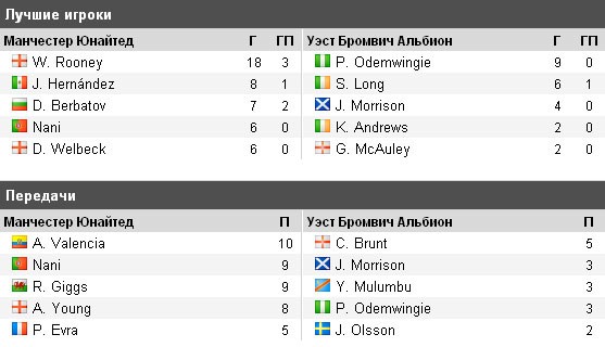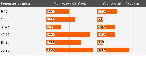 Лучше всего «Манкунианцам» удаётся забивать головой, всего 13 мячей заколотили «Редс» Вест Бромвич:
