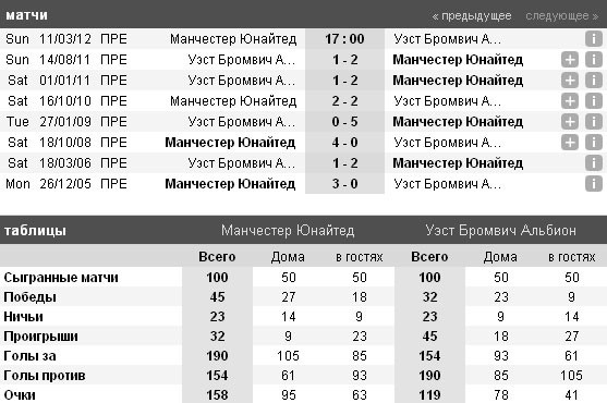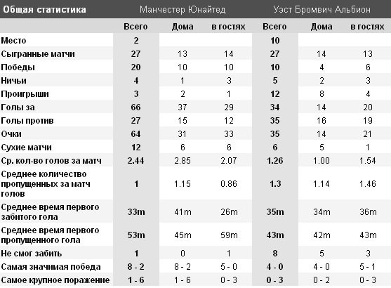 Всего «Манчестер Юнайтед» и «Вест Бромвич» провели между собой 120 матчей, из которых 50 побед на счету «Редс», 40 раз одерживали победу «Дрозды» и 29 раз команды расходились миром.
