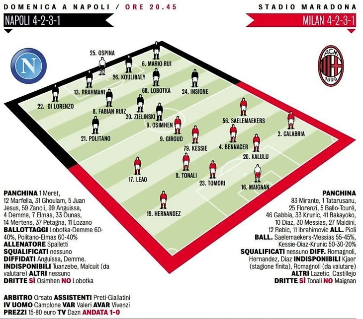 Расстановка полузащиты красно-чёрных в Неаполе, как предполагает La Gazzetta dello Sport, может предстать проверенной версией победного дерби. Так Исмаэль Беннасер составит дуэт с Тонали, а Кессье будет выдвинут ближе к атаке, где бельгиец Алекс Салемакерс и Рафа Леау будут на с флангов помогать Оливье Жиру. Такой план Пиоли сработал в матче с «Интером»: Франк Кессье, находясь в линии нападения, отвлекал сразу двух игроков соперника, а затем свежий Браим Диас разорвал своими проходами не успевшую перестроиться оборону Симоне Индзаги. Вспомним и последний поединок 2021 года, тогда более слабый противник был приговорён двумя голами ивуарийца, сыгравшего «десятку», уже в первом тайме [прим. - «Эмполи-Милан» - 2:4].