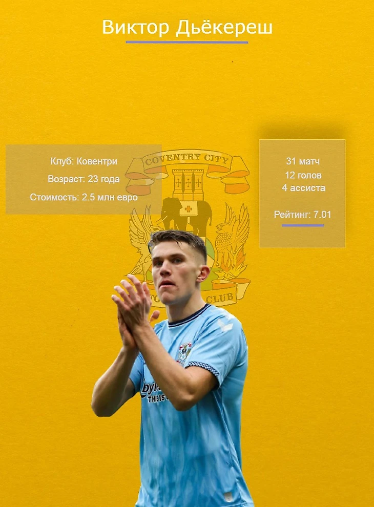 23-летний футболист, игрок Ковентри и нападающий Шведской сборной. Виктор прошел долгий путь с академии шведского клуба до Брайтона, после чего был продан в Ковентри за 1.2 млн евро. Сейчас швед стоит в два раза больше – 2.5 млн евро.