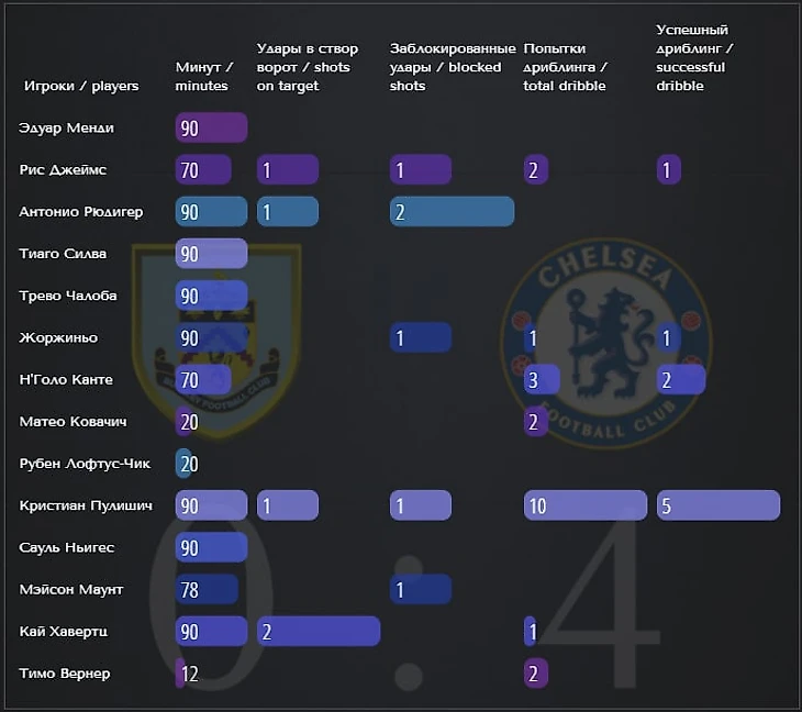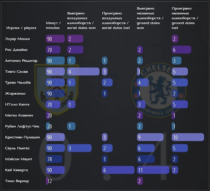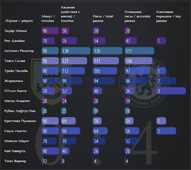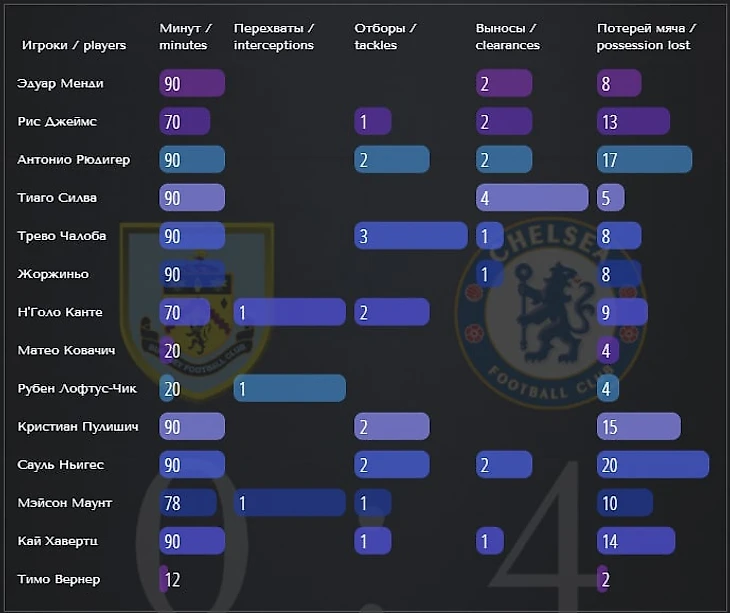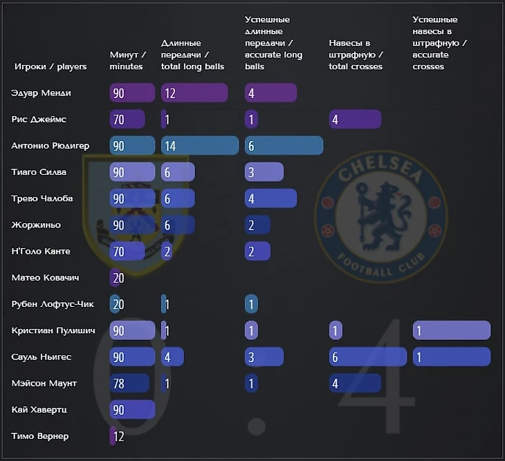 За первые 8 минут матча "Челси" отдал целых 7 длинных передач. А за весь тайм таких передач набралось 25. (54 лонгболла за 90 минут). По всей видимости, Тухель сделал акцент на выход из-под прессинга "Бернли" именно через длинные передачи в зоны, где есть свободные пространства. Точность пасов и обработка мяча оставляет желать лучшего, поэтому к опасности у ворот "Бернли" это не привело.