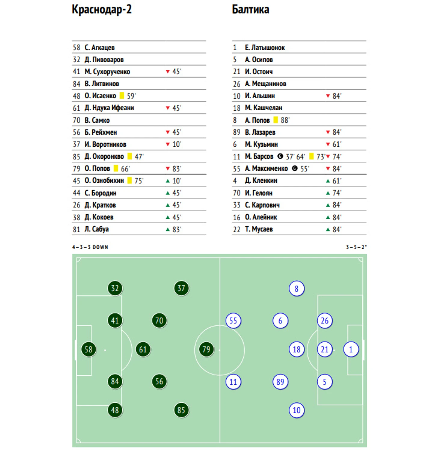 ● У «Краснодара-2» прервалась серия из пяти матчей без поражений. ● Из девяти последних матчей «Балтика» проиграла лишь один, а выиграла шесть. ● «Краснодар-2» и «Балтика» встречались в ФНЛ семь раз и ни разу не сыграли вничью. Счёт побед – 4:3 в пользу калининградцев.