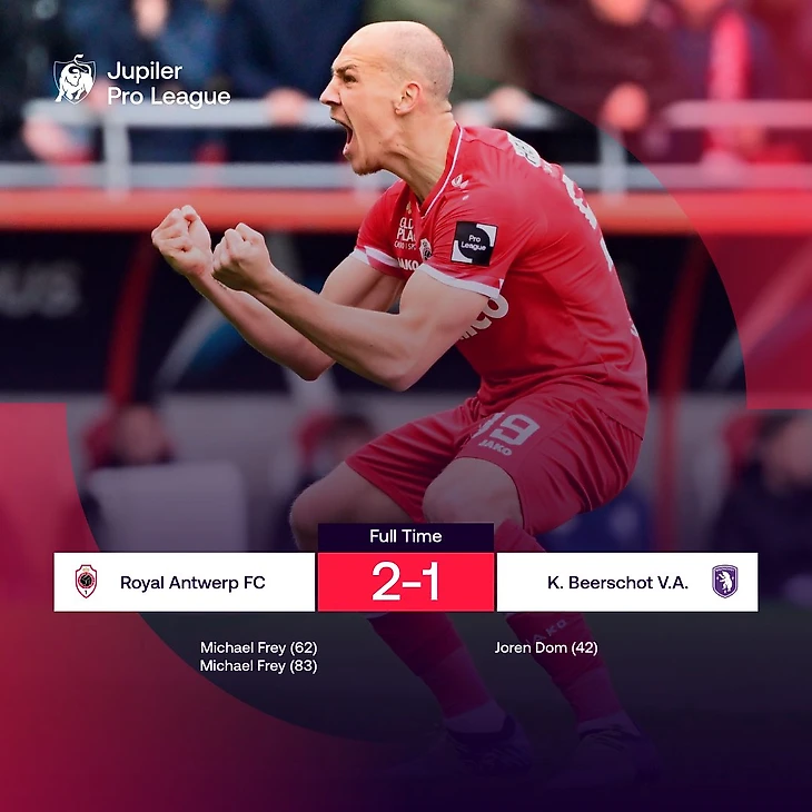 Такой расклад хозяев совершенно не устраивал. Во втором тайме они продолжили наседать и отыгрались. А после 70-й минуты у «Берсхота» опять все сломалось: сначала де Смет получил третью красную карточку в сезоне, потом из-за фола в атаке отменили гол Шенкленда, а затем Фрай принес «Антверпену» победу. Благодаря дублю швейцарец снова возглавил гонку бомбардиров. У него уже 22 гола!