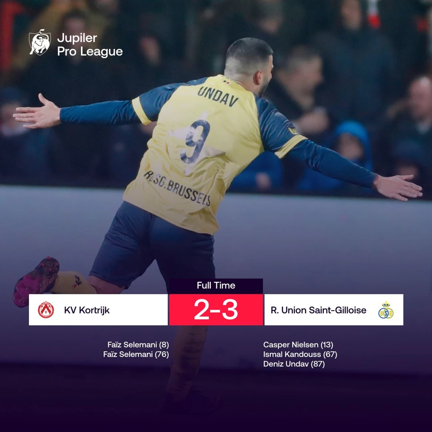 Вся надежда «Кортрейка» была на контратаки – и одна из них получилась идеальной. Селемани, изящно отыгравшись в стенку с Эненом, оформил дубль в ворота бывшего клуба. Но избежать очередного поражения хозяевам не удалось: под занавес встречи Ундав, вернувшийся в основу после дисквалификации, потрясающим ударом в «девятку» из-за пределов штрафной принес «Юниону» три очка.