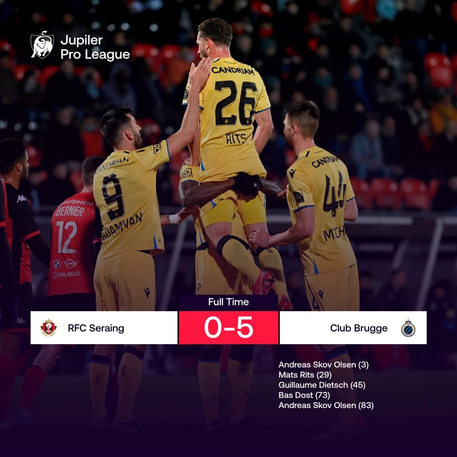 Андреас сделал 3+1, хотя третий гол «Брюгге» в итоге засчитали как автогол (главный арбитр ван Дриссхе обманул Андреаса, заверив, что гол запишут на него). Но даже без него у новичка, которого зимой купили у «Болоньи» за 6 миллионов евро, уже 3+4 в пяти матчах Про-Лиги!