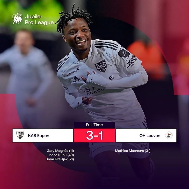 Ну надо же: «Эйпен» впервые победил с конца декабря. Если учитывать конкретно чемпионат – то с начала декабря. Во многом это заслуга нападающего «панд» Превляка: он еще в начале матча сделал ассист, потом постоянно терзал оборону «Левена», а во втором тайме упрочил преимущество команды, забив девятый гол в лиге.