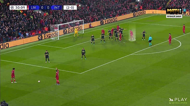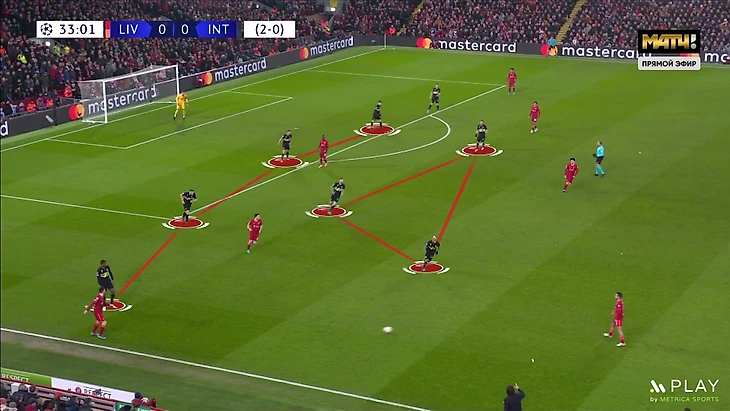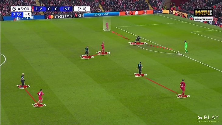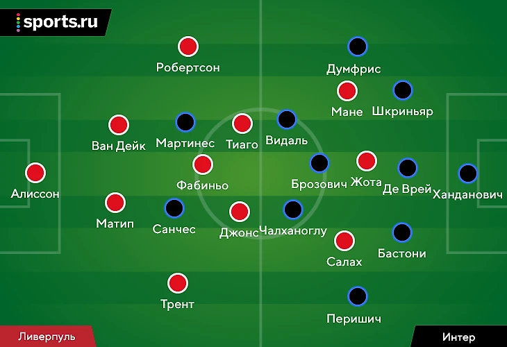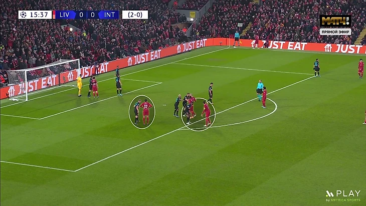 При стандартах угроза «Ливерпуля» исходила от центральных защитников – Матипа и Ван Дейка. «Интер» использовал смешанную систему опеки и против защитников «Ливерпуля» играли персонально: с Матипом – Шкриньяр; с Ван Дейком – Думфрис.