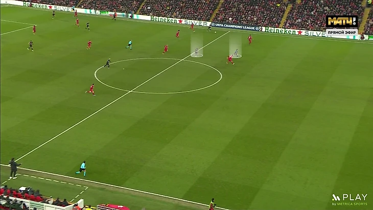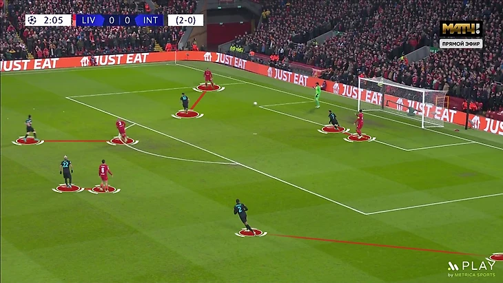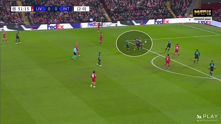 Снова «Интер» вне схемы – попытались далеко выбить, но борьбу выиграл Ван Дейк. На подборе Жота сохранил мяч под давлением двух соперников и создал комфортную ситуацию для Мане и Салаха: