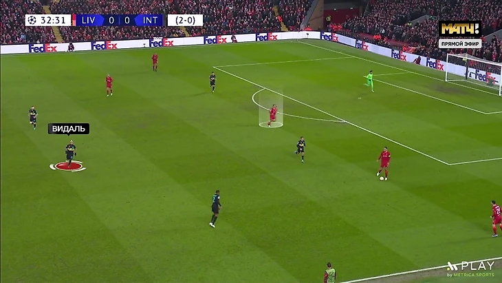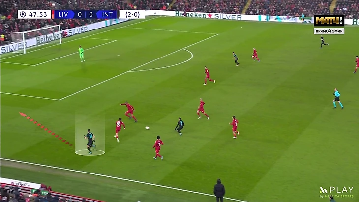 Тут «Интер» вне схемы, так как только что потерял мяч, трое пытаются накрыть Тиаго, а он все равно доставляет в штрафную – завершится супермоментом Салаха: