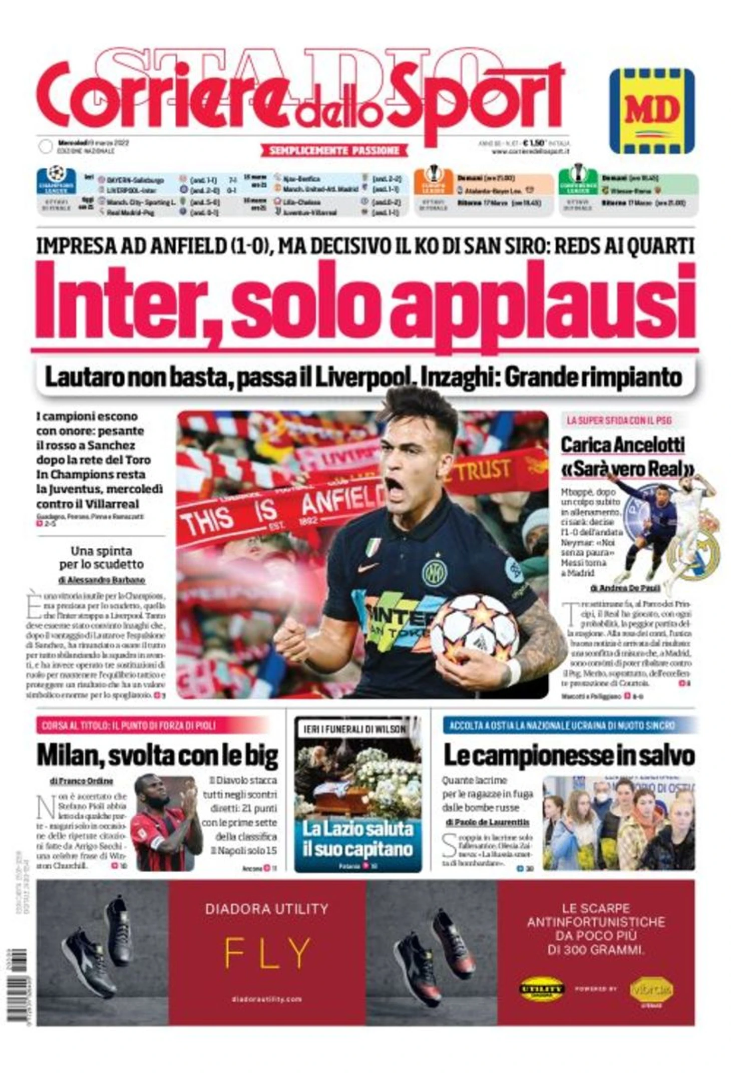 «Интер», только аплодисменты» – таким заголовком Corriere отметила вылета Нерадзурри из Лиги Чемпионов: «Успех на «Энфилде» (1:0), но решающим стало поражение на «Сан Сиро»: «красные» в четвертьфинале. Лаутаро не хватило, дальше прошёл «Ливерпуль». Индзаги: «Большое сожаление». Чемпионы вылетели с гордостью: весомая красная Санчесу после гола «Быка». В Лиге Чемпионов остался «Ювентус», играющий в среду против «Вильярреала».