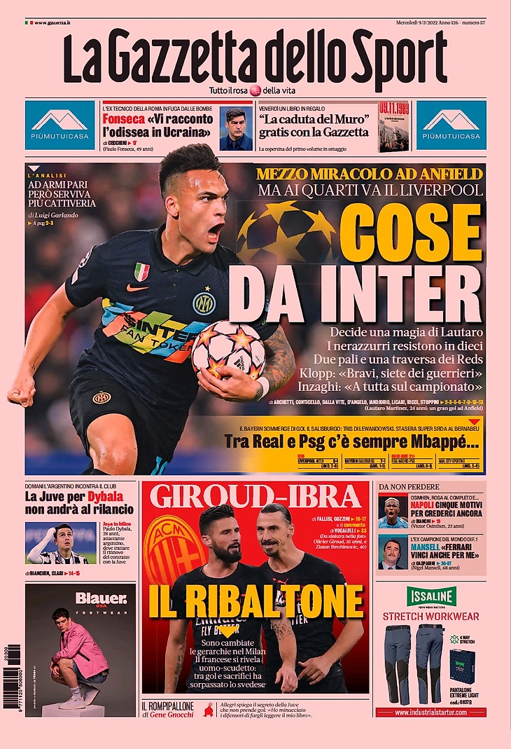 Подобный же заголовок «Выбыли с гордостью» дал и TuttoSport: «Интер» выиграл на «Энфилде» и упустил успех: ошеломляющий гол Лаутаро, но красная Санчесу 80 секунд спустя после, остановив невероятный камбэк. Три штанги «Ливерпуля». «Бавария» забила 7 «Зальцбургу».