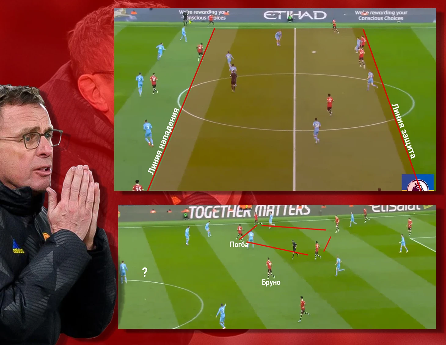 Данная схема трансформировалась в 4-2-4, и довольно часто между линиями нападения и защиты образовывалась пропасть. В момент когда Линделёв делал обостряющую передачу, Фред с МакТомини застревали где-то очень далеко от Погба и Бруно, это означало, что при потере мяча Юнайтед не удастся своевременно включиться в контрпрессинг и забрать мяч, хотя футбол Рангника как раз и предполагает быструю реакцию на потерю.