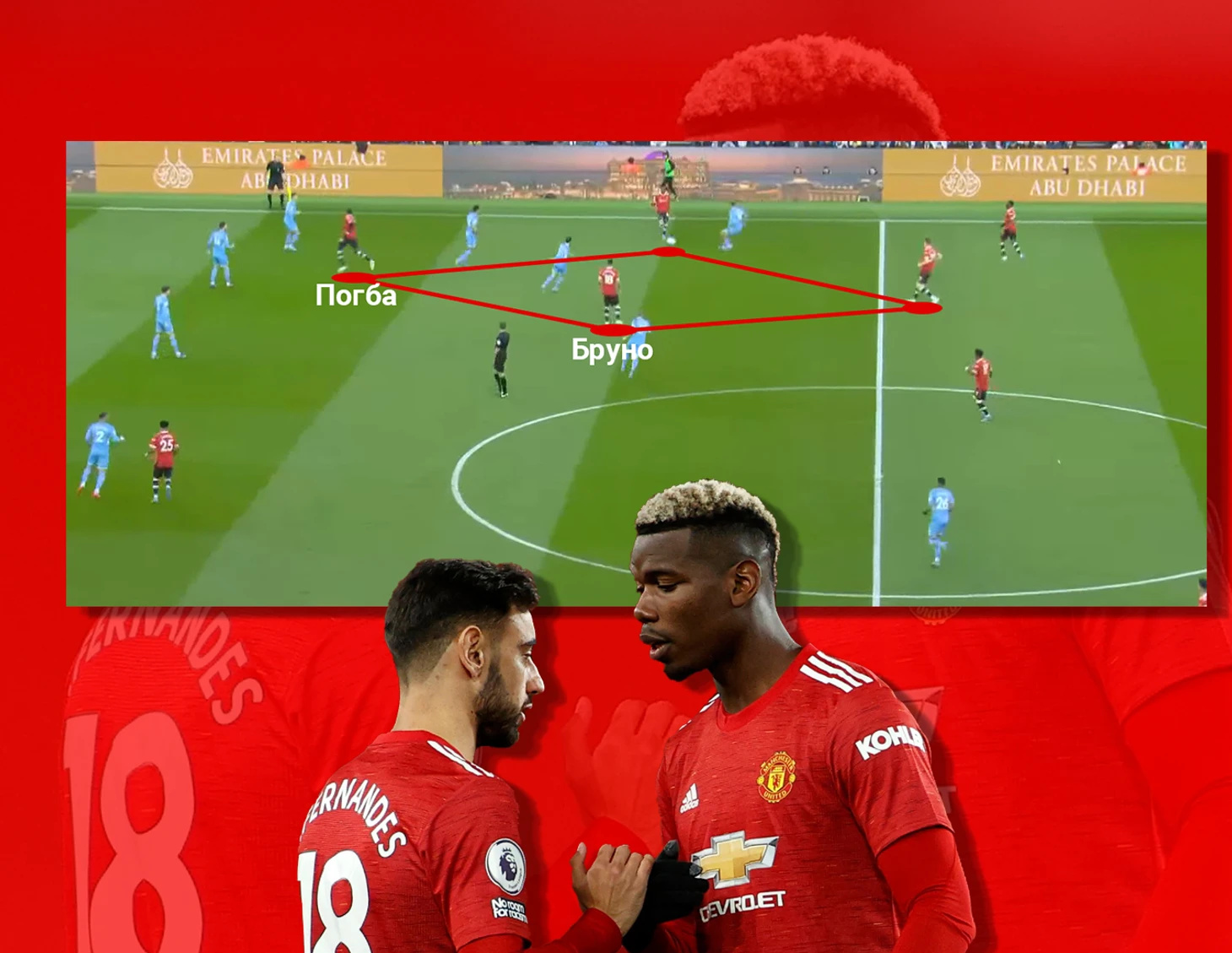 Юнайтед же впервые в сезоне играл в схеме 4-2-2-2 (4-2-4) без форвардов. Номинальными центральными нападающими были Поль Погба и Бруно Фернандес.