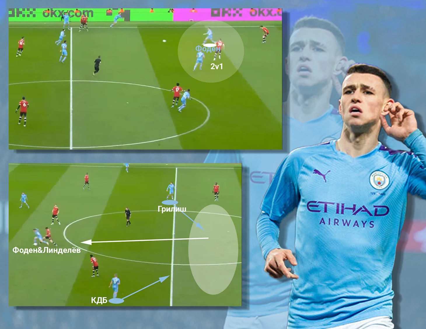 На скрине видно, что Де Брюйне и Грилиш видят освободившееся пространство после опускания Фодена и готовы туда ворваться.
