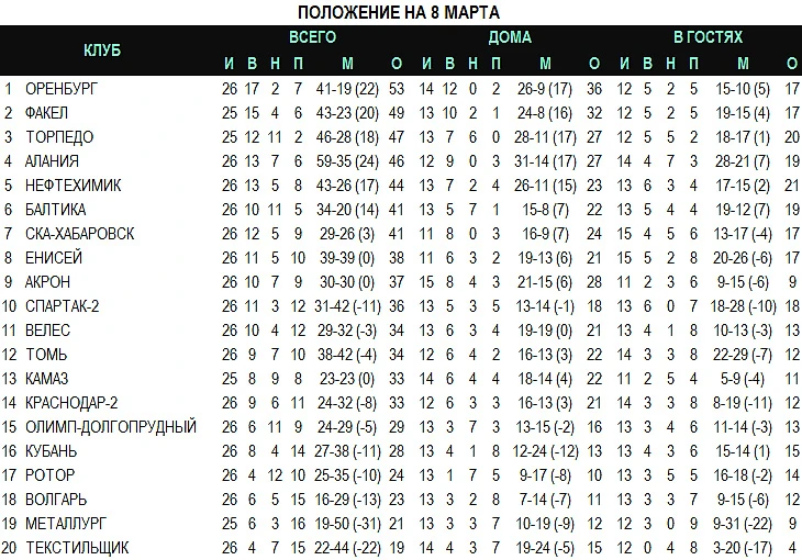 12 марта пройдут матчи 27-го тура первенства ФНЛ, центральным событием которого станет поединок «Торпедо» - «Балтика». «Оренбург» отправится в гости к продолжающему падение «Ротору», «Факел» сыграет в Краснодаре с местными «быками».