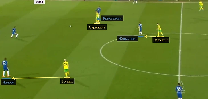 Дин Смит подстроился под «Челси». Если обычно «Норвич» защищается по 4-1-4-1, то гостей из Лондона встретил схемой 5-3-2. Без мяча Теему Пукки и Джош Сарджент следили за крайними центральными защитниками Тухеля. Один из хавбеков опекал Жоржиньо.