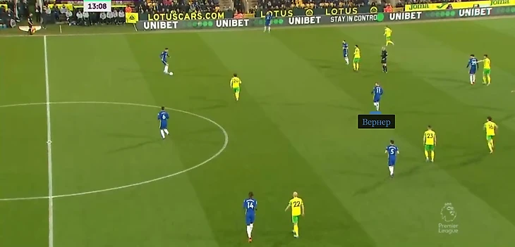 «Норвич» в целом допускал слишком много пространства между линиями. «Челси» оказалось достаточно пройти блок 3-2, который изображал прессинг, – выше возникали свободные зоны. Доказательство – 10-я минута, когда Ковачич после удачной обводки легко дотащил мяч до Вернера. Прострел немца прилетел в руки Тиму Крулу.