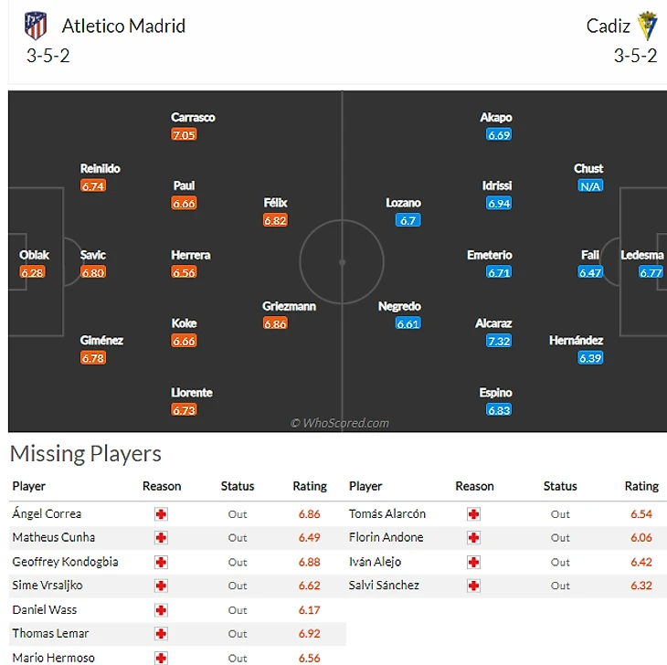 На что обратить внимание: На Лигу чемпионов. Уже во вторник Атлетико предстоит встреча с Манчестер Юнайтед. И поэтому индейцам крайне важно откачать своих лидеров и не получить новых травм. Поэтому Корреа(8), Савич(6,5) и Коке(6) хоть и попали в итоговую заявку мадридцев - вряд ли выйдут сегодня на поле.