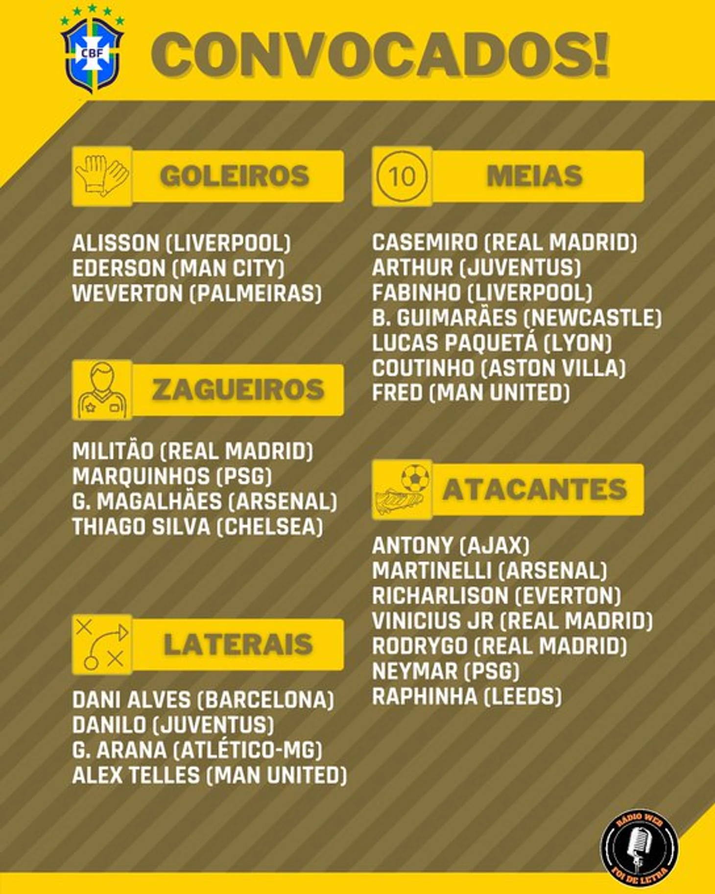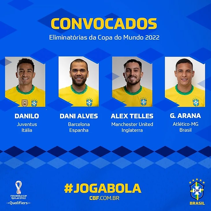 Арана вернулся. Надеюсь что второй шанс будет удачнее. Хотя понимаю,что этот вызов во многом из-за травмы Алекса Сандро. Снова Теллес. Вот только с практикой у него лучше не стало,даже наоборот. Лоди в январе напомните почему не вызвали? Мало практики и не было второй прививки от ковида. Теперь есть и то и другое, но все равно мимо сборной. Может дело не в прививке? Данило залечил травму,вернулся в старт "старой синьоры" и логично получил вызов Тите. Дани Алвес тоже, только про логичность я бы поспорил. К тому же почему было не попробовать снова Эмерсона. Ведь сам Тите сказал,что то глупое удаление никак не скажется на перспективах лондонца. Хотя слова с делами у тренера Бразилии очень часто расходятся с делом. Ну или мы его неправильно понимаем... Вера в лидерские качества и регалии это конечно хорошо, но он банально уже не успевает. Что показали 2 года в Бразилейрао,да и в финале ОИ опыт не помог,просто банально не успел,не добежал.