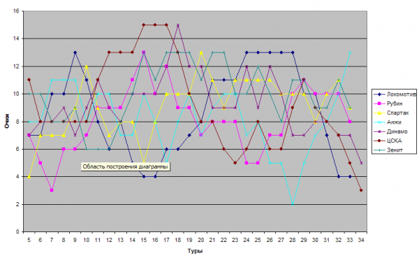 Итак, сегодня я решил рассмотреть чемпионат России по-новому, так скажем, на стратегическом уровне, а именно — провести изучение динамики взлетов и падений клубов, все еще имеющих определенные шансы на чемпионство, или хотя бы на попадание в квалификационный раунд Лиги Чемпионов, мы начнем с наиболее реального претендента – питерского Зенита. Сразу оговорюсь, что Кубань рассматривать не буду, т.к. краснодарские амбиции закончились, видимо сразу после 30 тура. Они входят по праву в первую восьмерку, но до «большой» семерки им еще, пожалуй, далековато. Но для начала немного о принципе подсчета очков и построения графиков. Я не стал изобретать велосипед и посчитал очки по принципу, положенному в основу системы подсчета очков в пресловутой таблице коэффициентов УЕФА с одним небольшим отличием – там считается сумма очков, набранных клубами одной федерации в течение последних 5 лет, а здесь – набранных одной командой в течение крайних 5 туров. Поэтому, собственно, шкала «Туры» и берет свой старт с цифры 5. За 5 туров команда может набрать от 0 до 15 очков (шкала Y). Шкала Х обозначает нумерацию туров, все понятно.