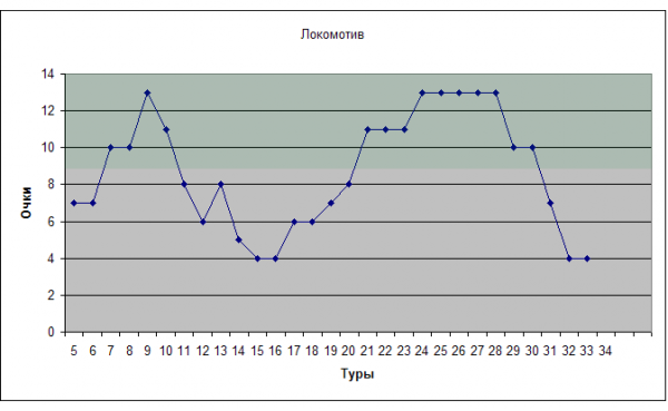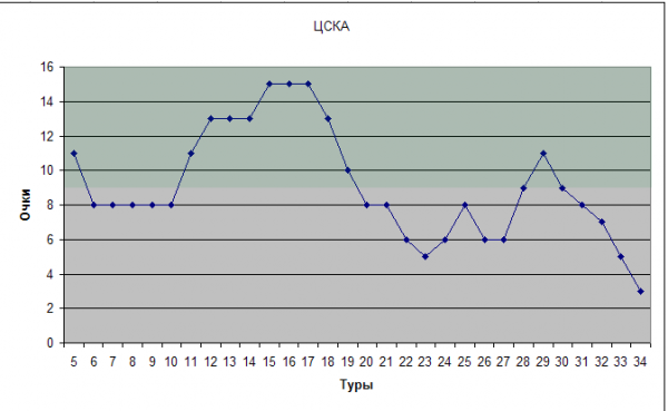 Этот график тоже красноречив. Начав за здравие и опередив Зенит на старте, армейцы разбазаривают преимущество с каждым туром. Показав потрясающий результат в конце первого круга, когда три! тура подряд команда суммарно набирала по 15 очков (а это помимо ЦСКА удалось только Динамо, и то лишь однажды), армейцы растеряв игру выпали даже из «зеленой зоны», а к 34-му туру и вовсе скатились на самое дно. Что-то определенно сломалось в армейском королевстве и ни уходом Вагнера, ни участием в ЛЧ это объяснить нельзя, ведь сломалось оно раньше.