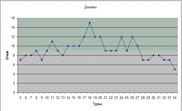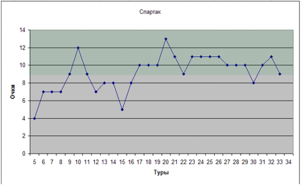 Такой подход позволяет наиболее полно и основательно изучить ход команд по турниру, основываясь на результатах игр в различные периоды времени, но при этом роль случайности (например, нелепого поражения) сведена к минимуму. Как известно, для победы в чемпионате или хотя бы достижения зоны Лиги Чемпионов команде в обычном 30-туровом чемпионате необходимо набрать примерно 55-65 очков, т.е. примерно 60%. Поэтому на всех диаграммах зеленым выделена зона, длительное нахождение графика в которой позволяет рассчитывать на очень хорошие и отличные результаты по итогам сезона.