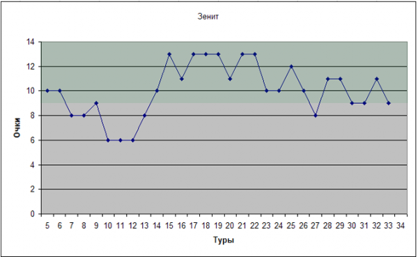 График говорит сам за себя. Слегка посвистев резиной на старте, Зенит вышел на рабочую температуру и показывает очень стабильные результаты на протяжении практически всего сезона, без резких движений. Все всегда на уровне, что говорит о высоком классе команды, образцовой тренерской работе и хорошей обстановке внутри коллектива. Чемпионский график – ничего не скажешь.